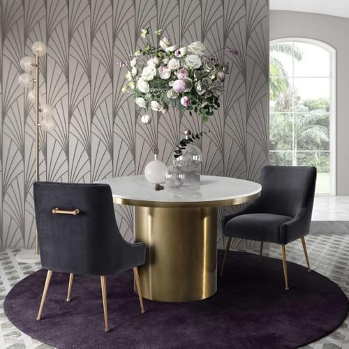 Sit pretty in this sumptuous yet durable velvet chair. The mason chair dazzles as a dining chair or as an accent piece. Available in several velvet options with fab gold legs and a matching handle on the back. Prop it into any room for a luxe, glamour effect.